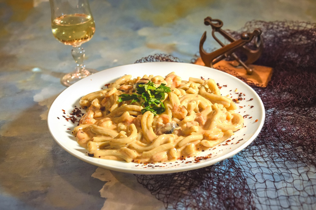 Shrimps with fresh Chios traditional pasta with pasta with basil
