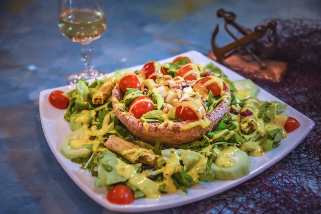 Salad with spinach, arugula, lettuce, cucumber, tomato combined with local white cheese, crackers and light sauce